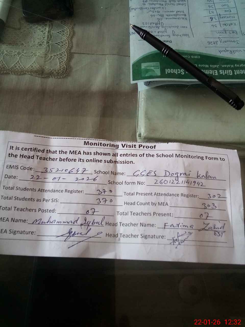 | Attendance Register | Head Teacher | MEA with School | Visit Proof |