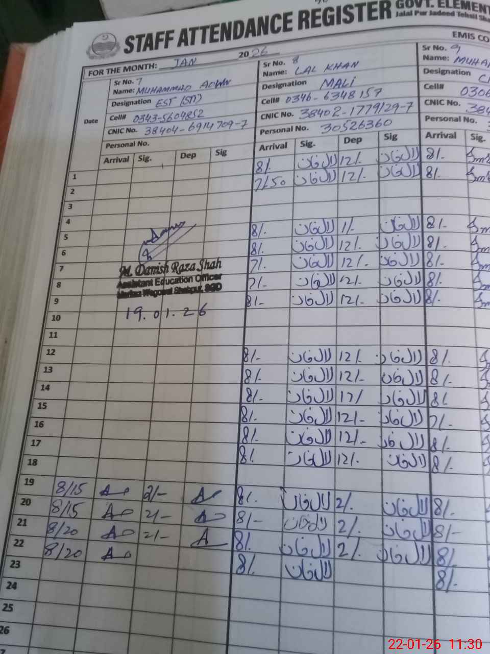 | CNIC | Full Name | Designation | R/C | Absence during last cal. month |