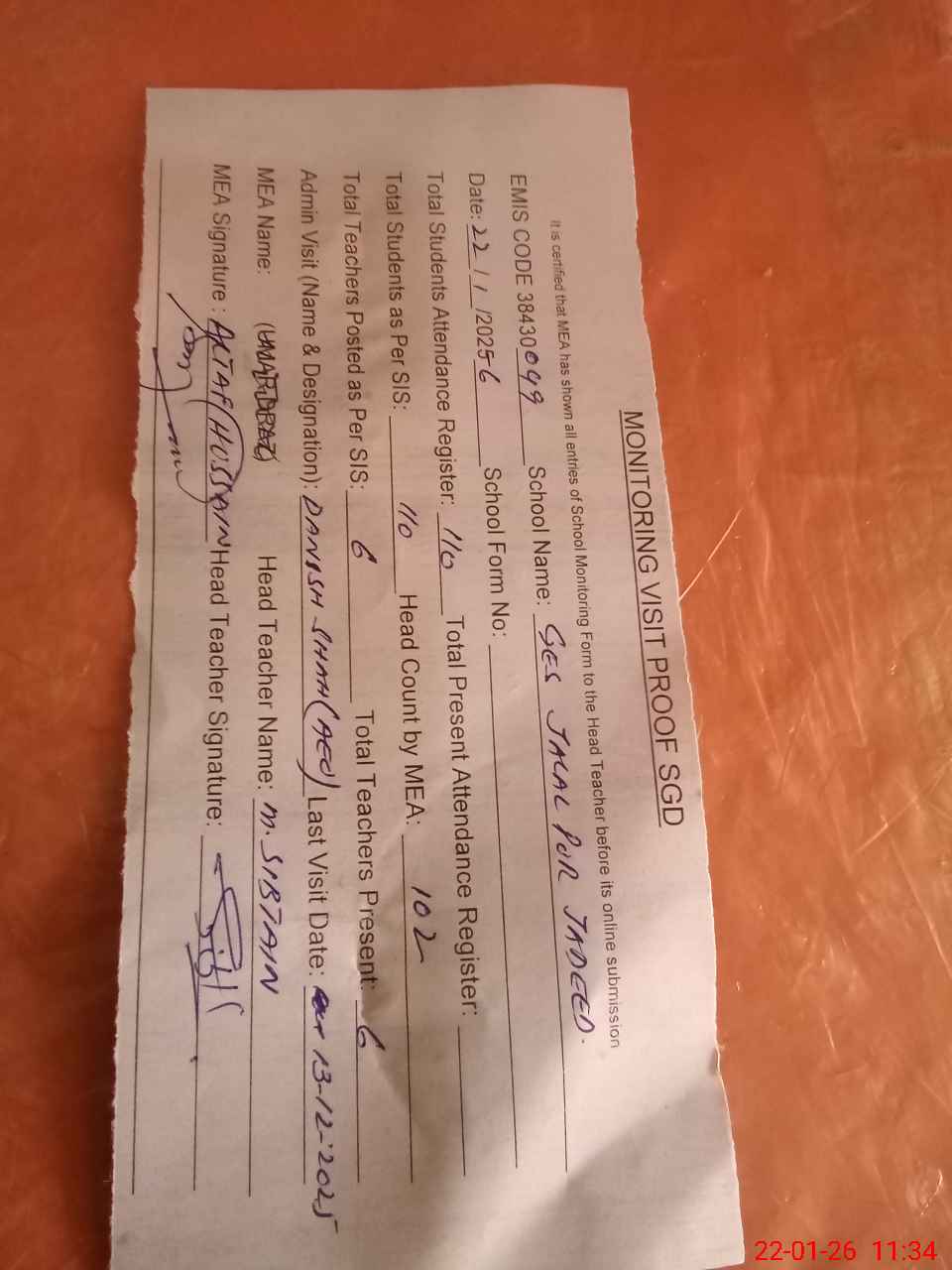 | Attendance Register | Head Teacher | MEA with School | Visit Proof |