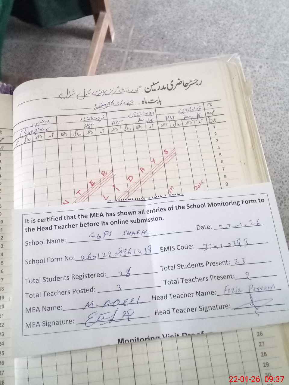| Attendance Register | Head Teacher | MEA with School | Visit Proof |