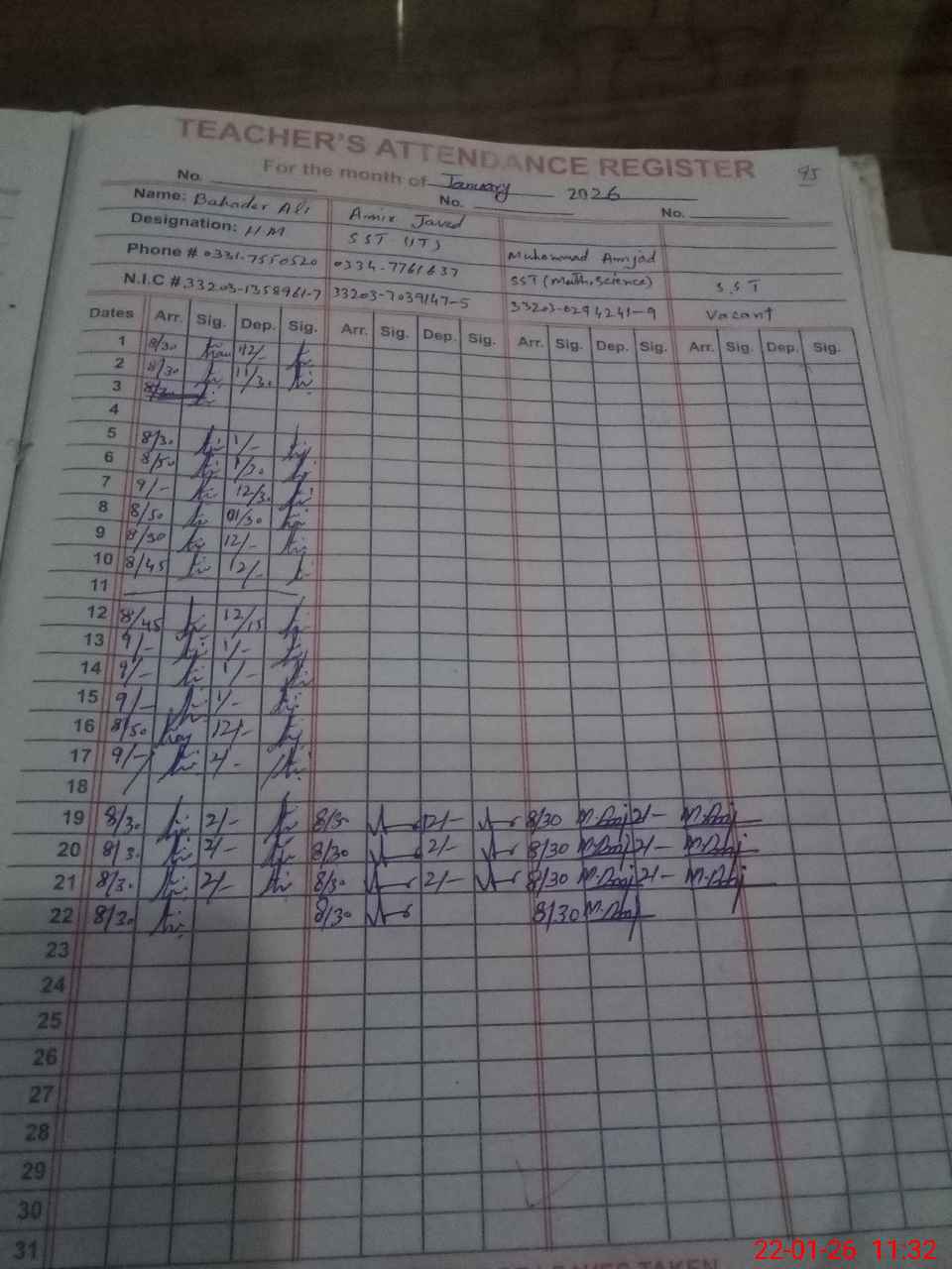 | CNIC | Full Name | Designation | R/C | Absence during last cal. month |