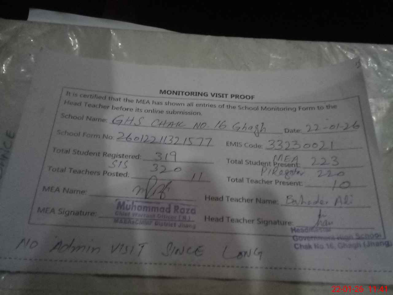 | Attendance Register | Head Teacher | MEA with School | Visit Proof |