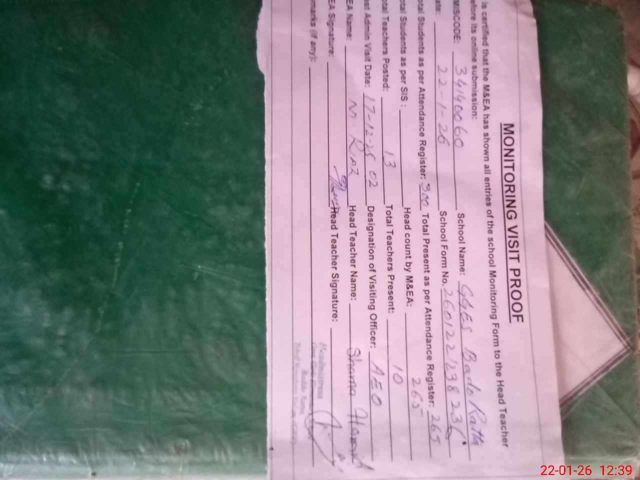 | Attendance Register | Head Teacher | MEA with School | Visit Proof |