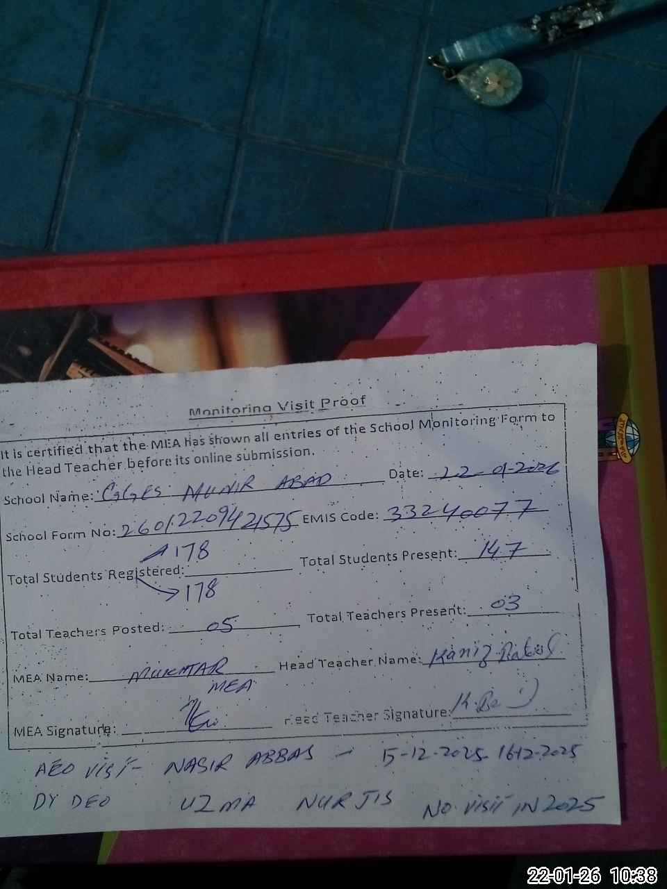 | Attendance Register | Head Teacher | MEA with School | Visit Proof |