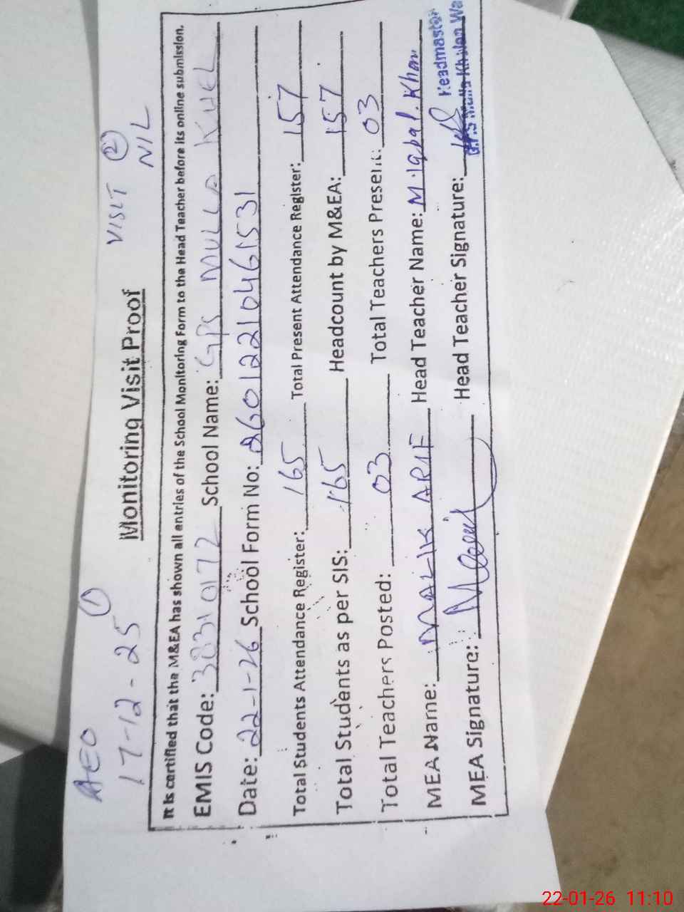| Attendance Register | Head Teacher | MEA with School | Visit Proof |