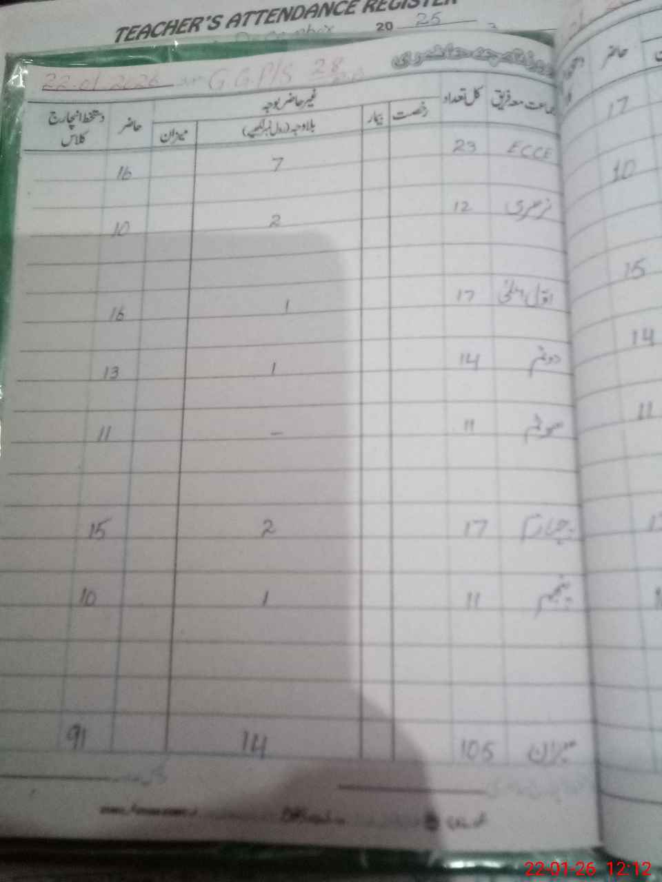 | Remarks (Use Separate Page if Required): ggps 28 mb still dent on sis 105 still dent on register 105 head count 91 one teacher present one on attachment in other school last visit ddeo 18/12/25 class room required | |||||