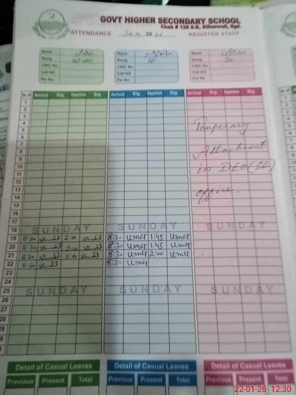 | CNIC | Full Name | Designation | R/C | Absence During Last Calender Month |
