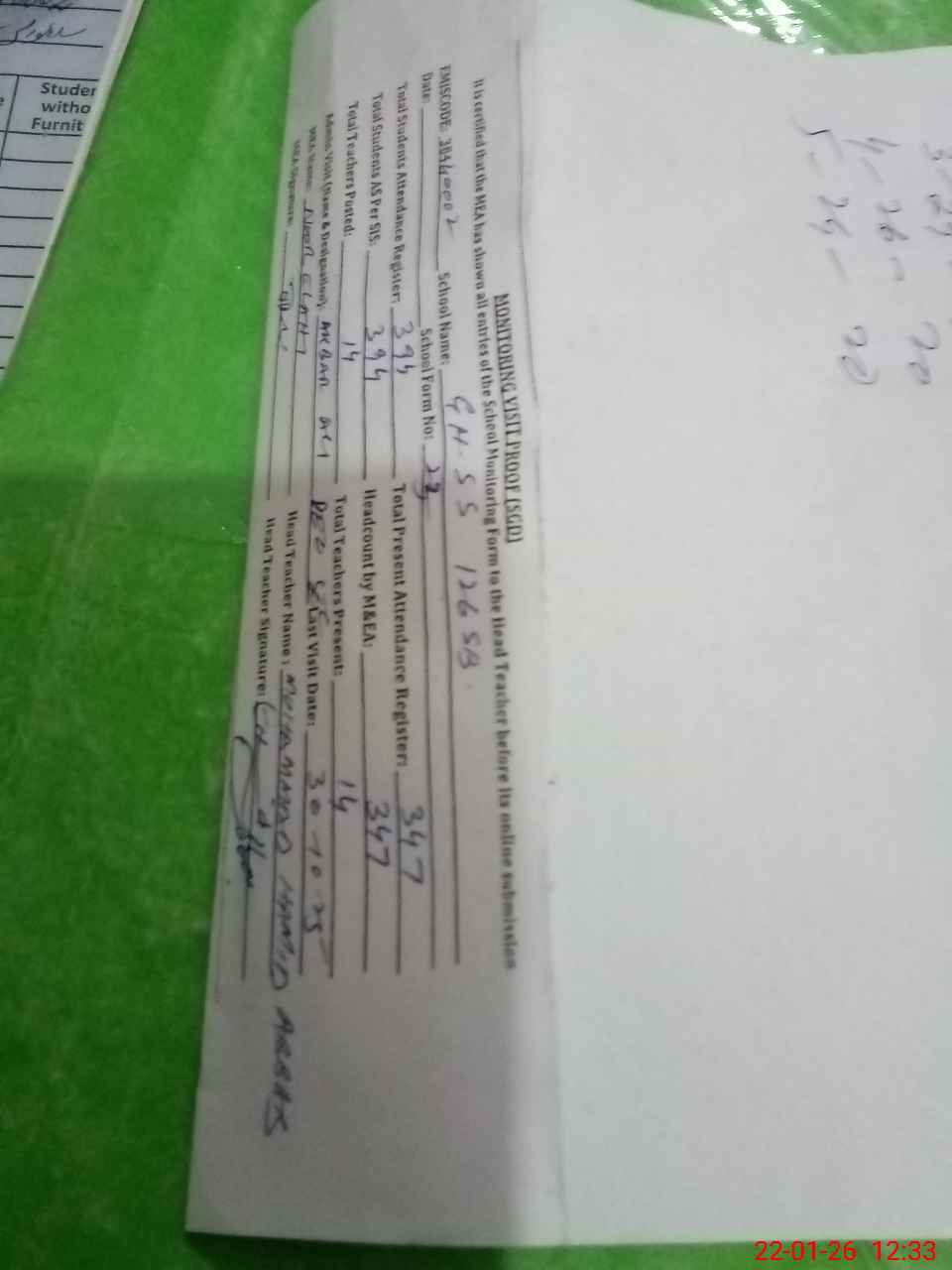 | Attendance Register | Head Teacher | MEA with School | Visit Proof |