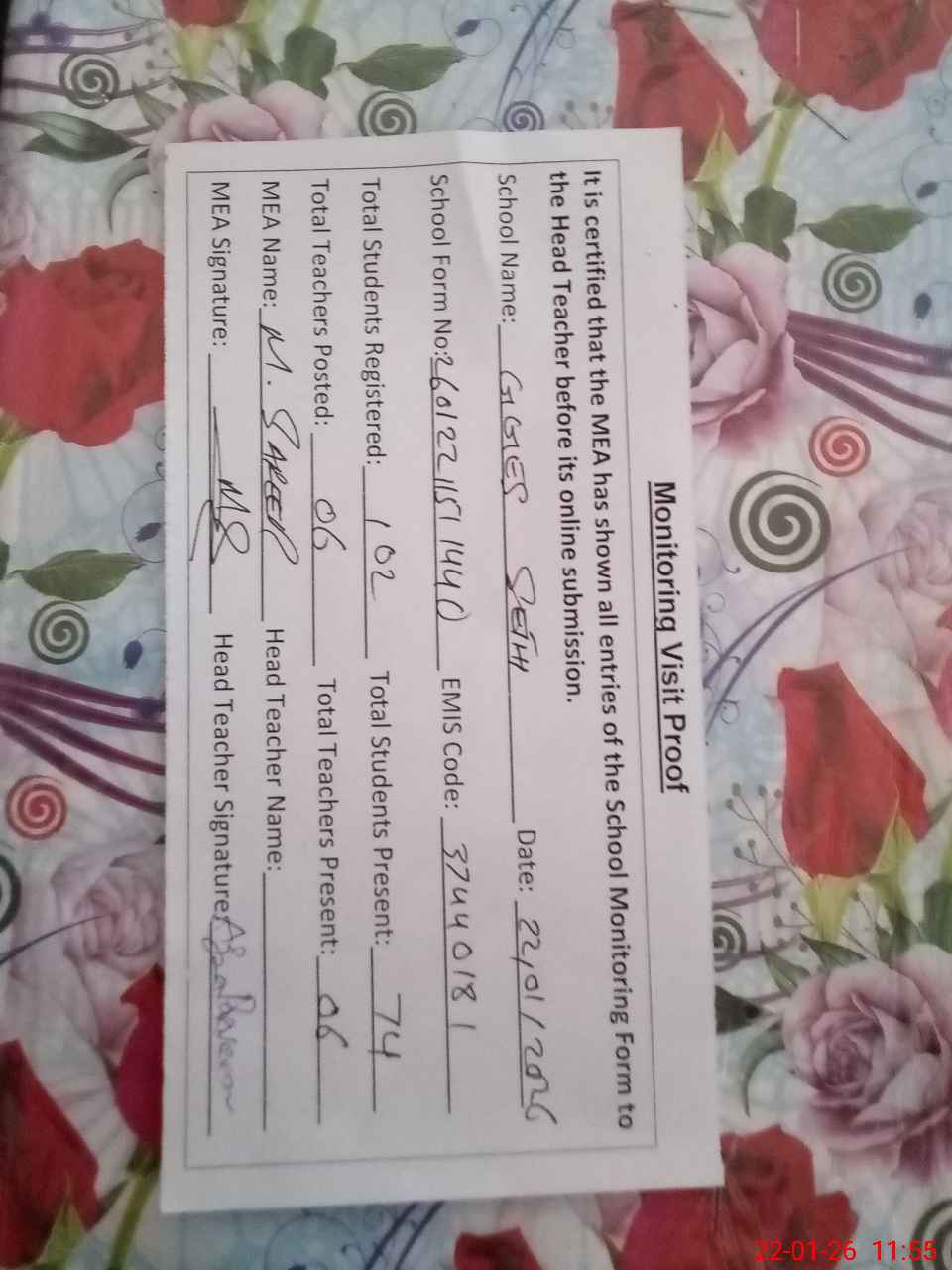 | Attendance Register | Head Teacher | MEA with School | Visit Proof |