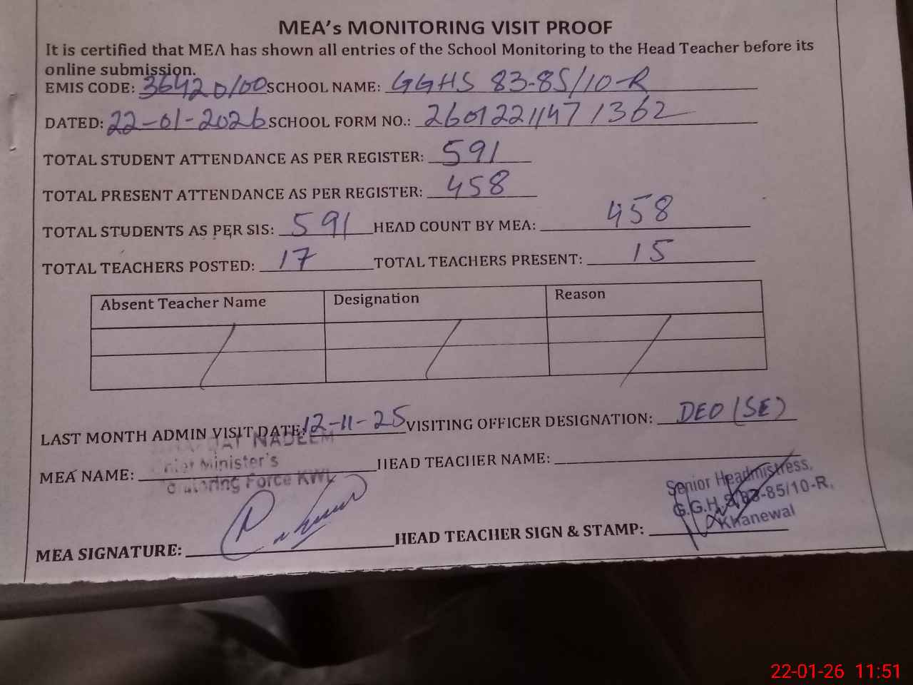 | Attendance Register | Head Teacher | MEA with School | Visit Proof |