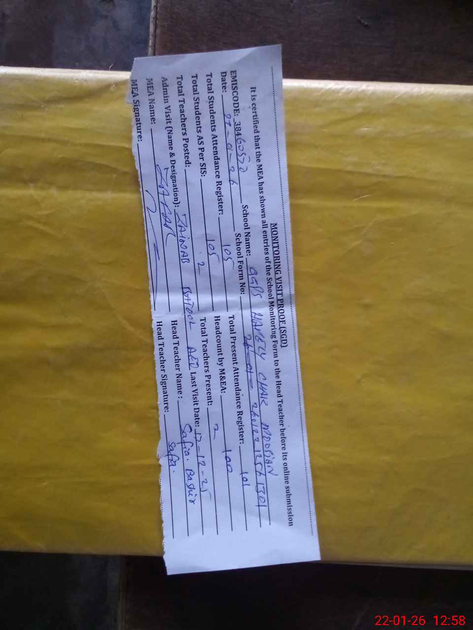 | Attendance Register | Head Teacher | MEA with School | Visit Proof |
