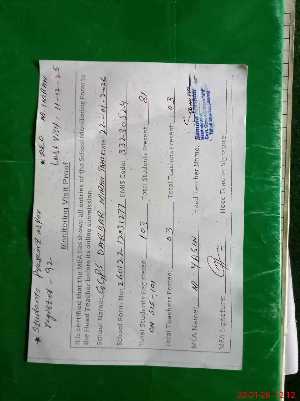 | Attendance Register | Head Teacher | MEA with School | Visit Proof |