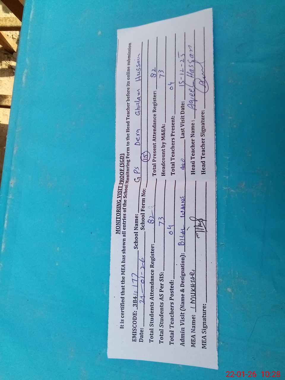 | Attendance Register | Head Teacher | MEA with School | Visit Proof |