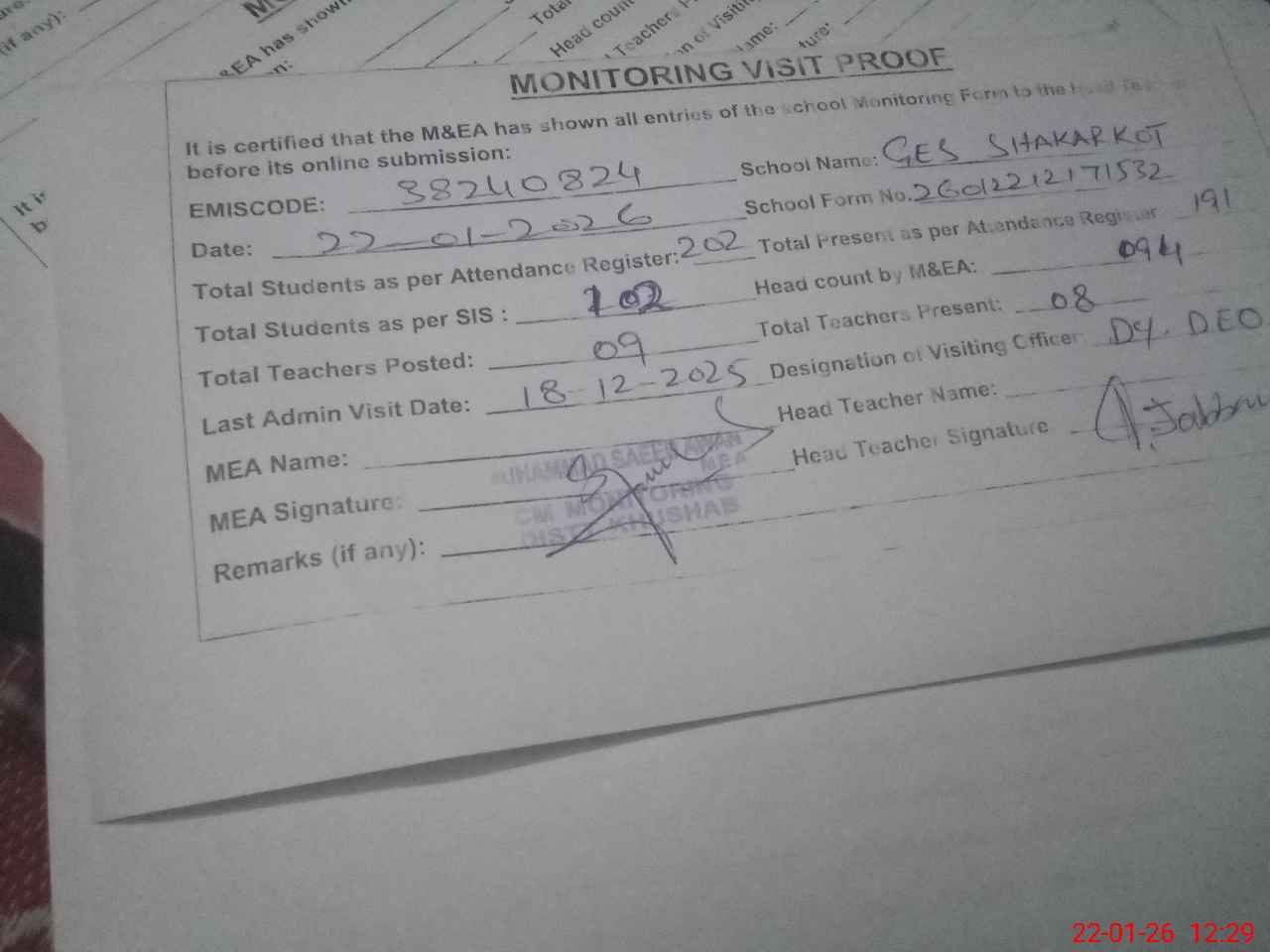 | EMIS Code: 38240824 | Name of School: GES SHAKAR KOT | |||
