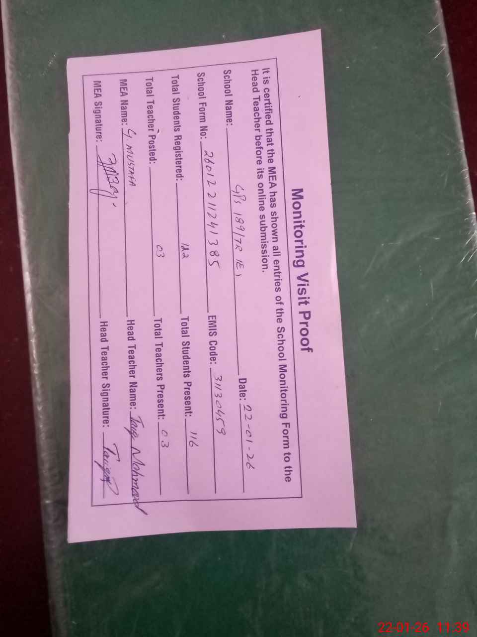 | Attendance Register | Head Teacher | MEA with School | Visit Proof |