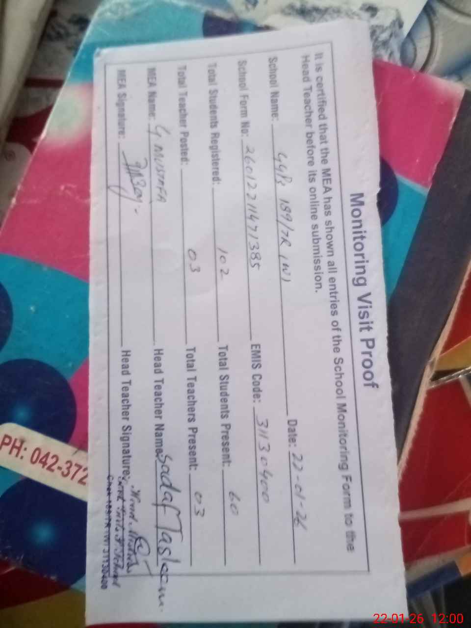 | Attendance Register | Head Teacher | MEA with School | Visit Proof |