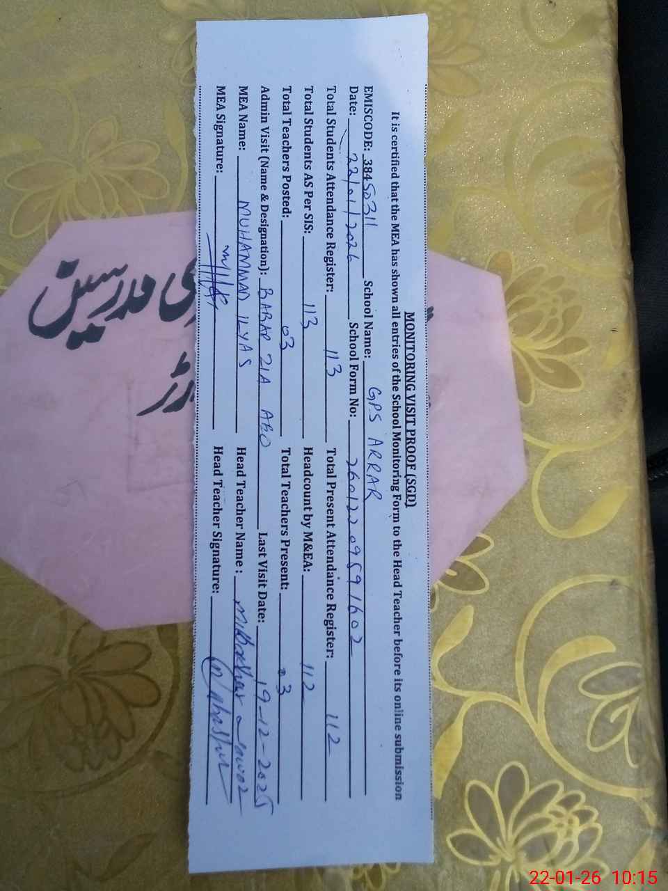 | Certified that this School was Inspected by the Undersigned MEA/DMO Today and the Information Stated Above is as Per Record. | |||||