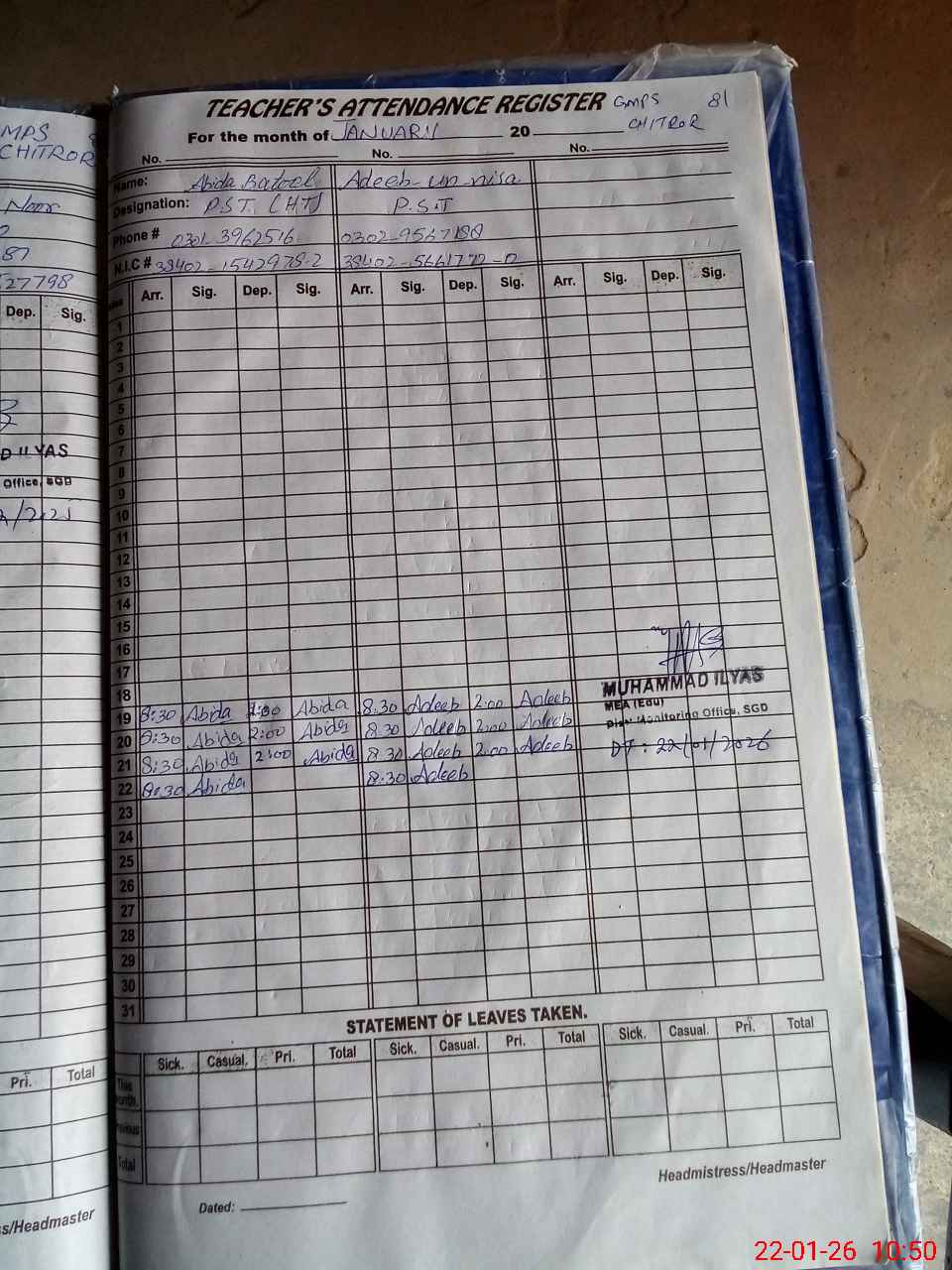 | Name: AA**** BA**** Designation: (School Headmaster's/Headmistress's) PST Phone/Cell Number: 03**** |