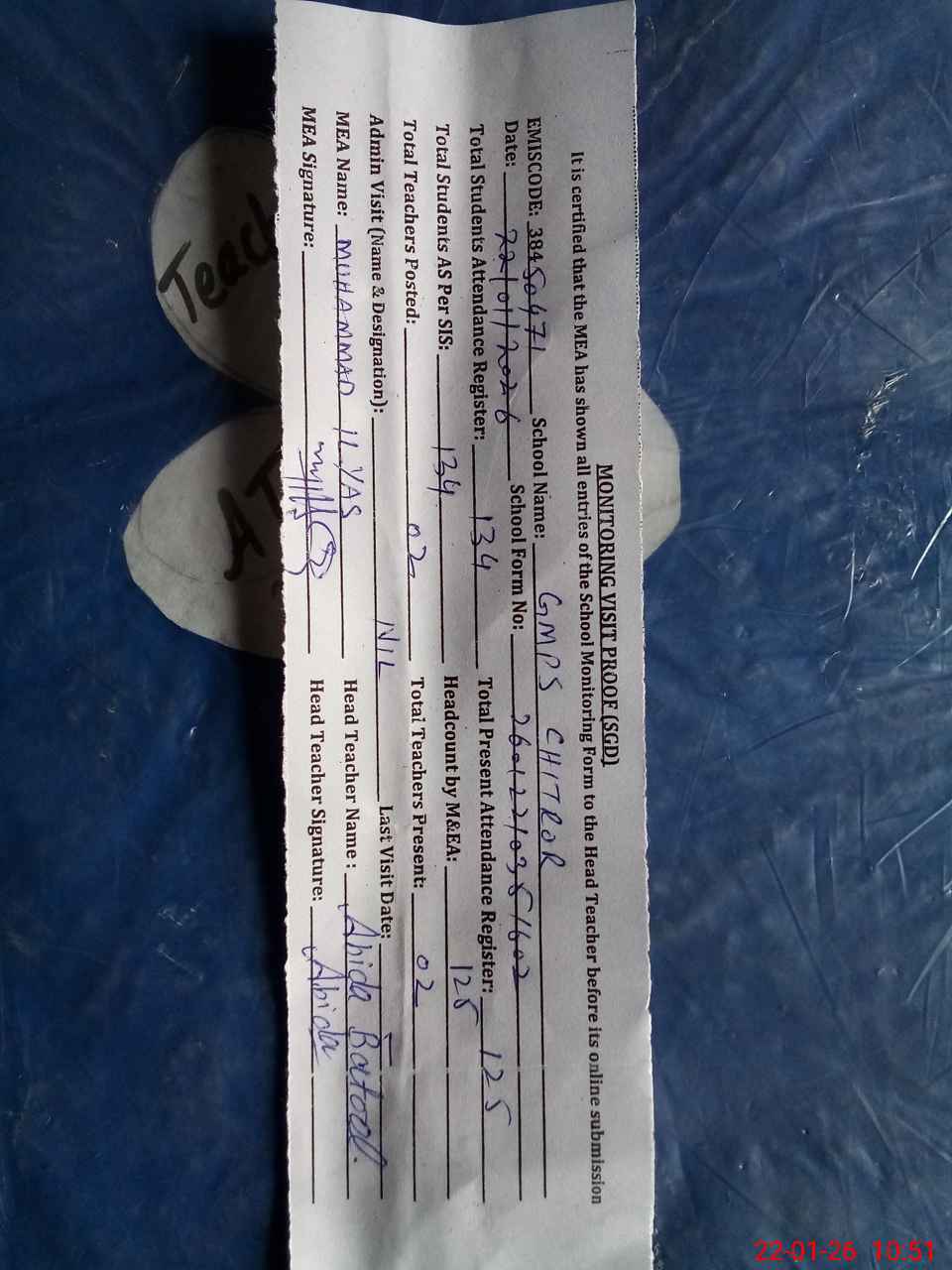 | Attendance Register | Head Teacher | MEA with School | Visit Proof |