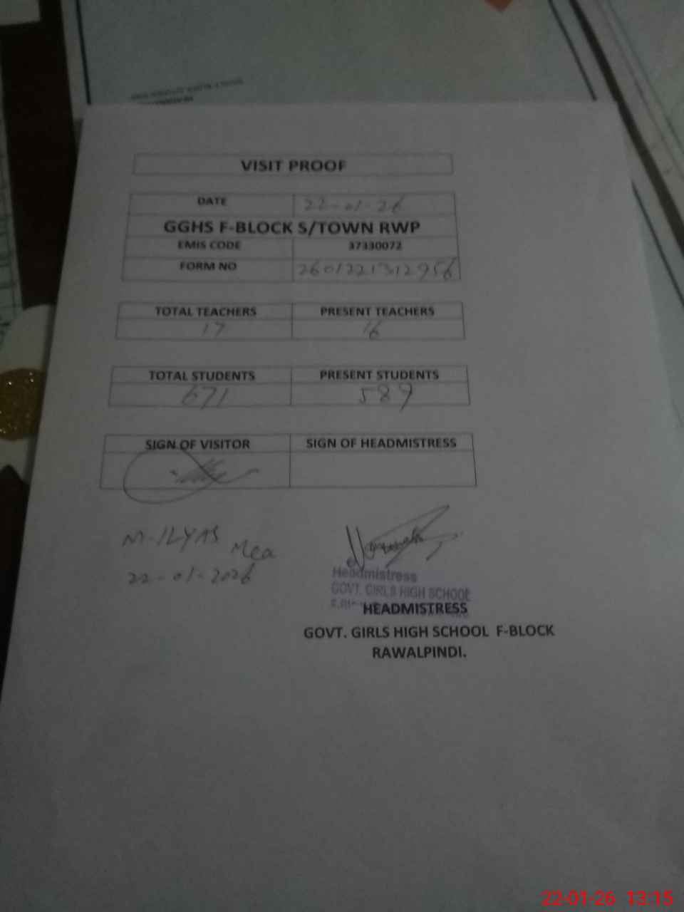 | EMIS Code: 37330072 | Name of School: GGHS F BLOCK RWP | |||