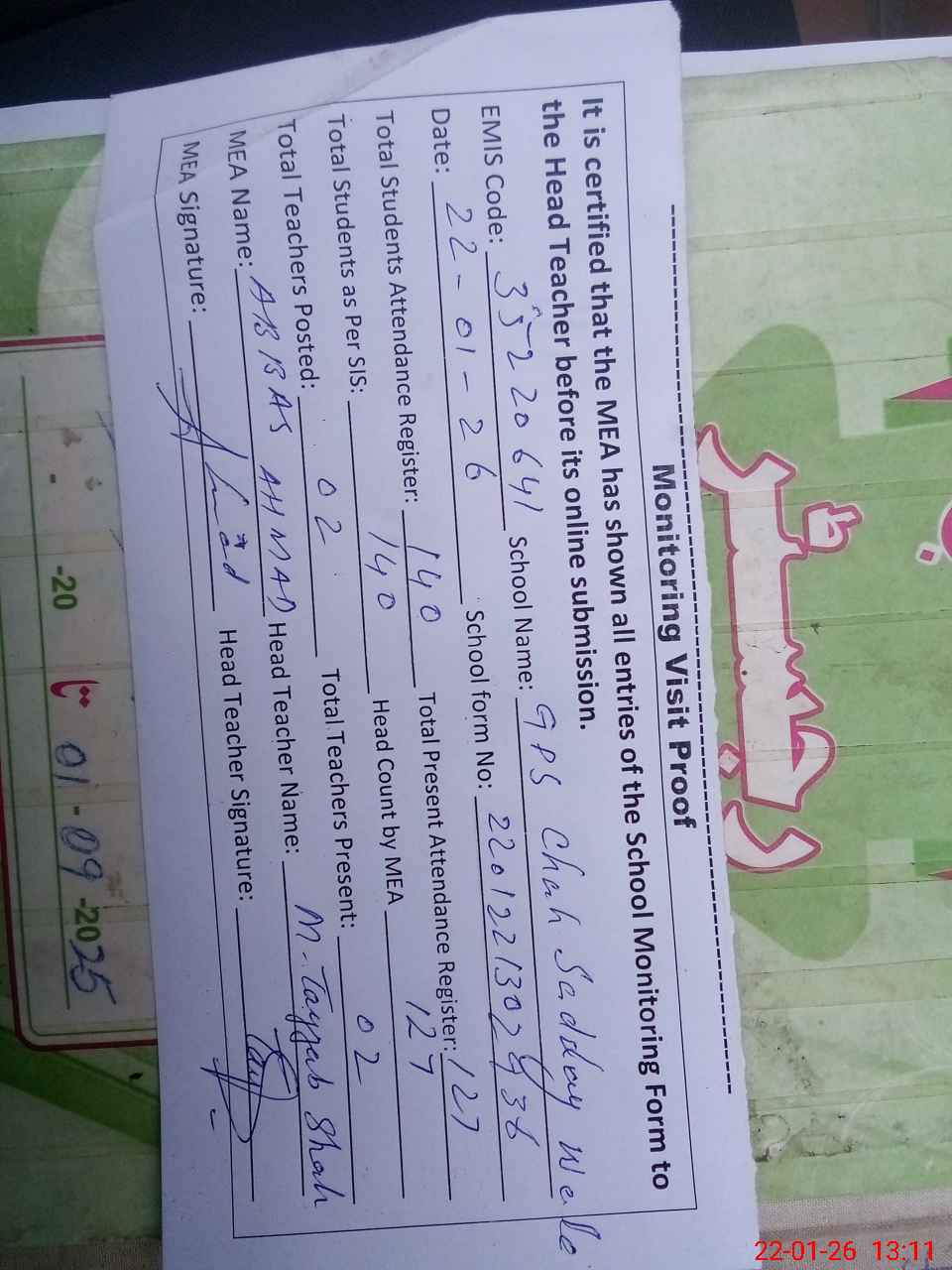 | Attendance Register | Head Teacher | MEA with School | Visit Proof |