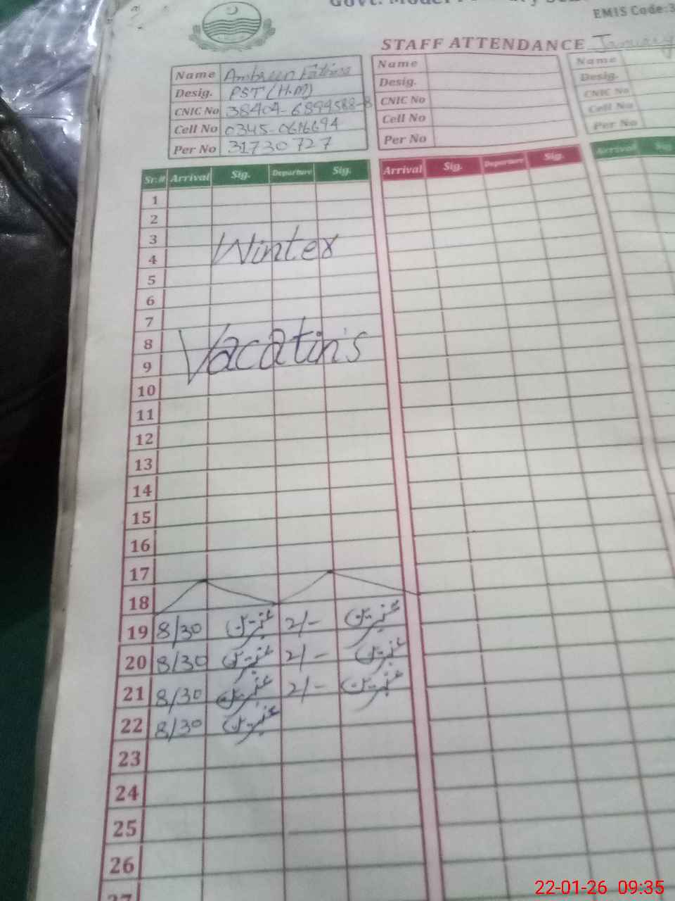 | Name: AM**** FA**** Designation: (School Headmaster's/Headmistress's) PST Phone/Cell Number: 03**** |