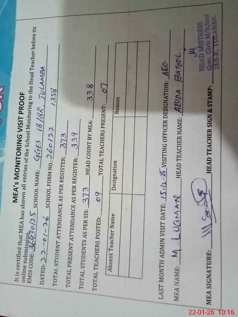 | Attendance Register | Head Teacher | MEA with School | Visit Proof |