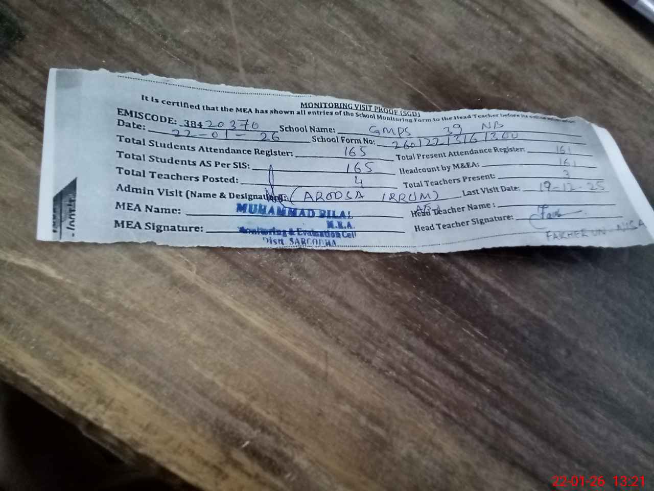 | Attendance Register | Head Teacher | MEA with School | Visit Proof |