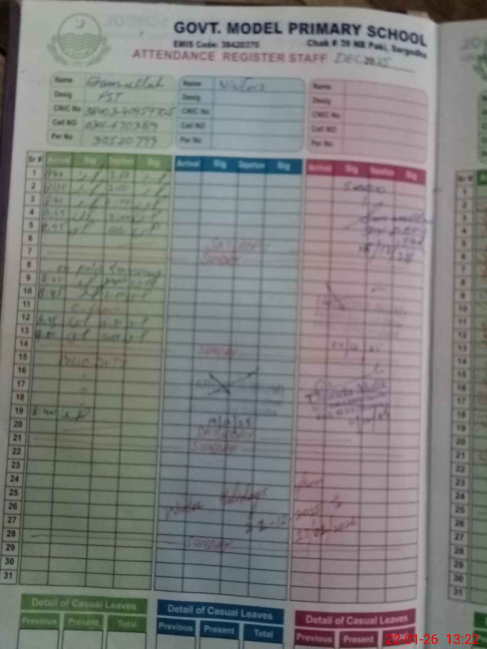 | CNIC | Full Name | Designation | R/C | Absence during last cal. month |