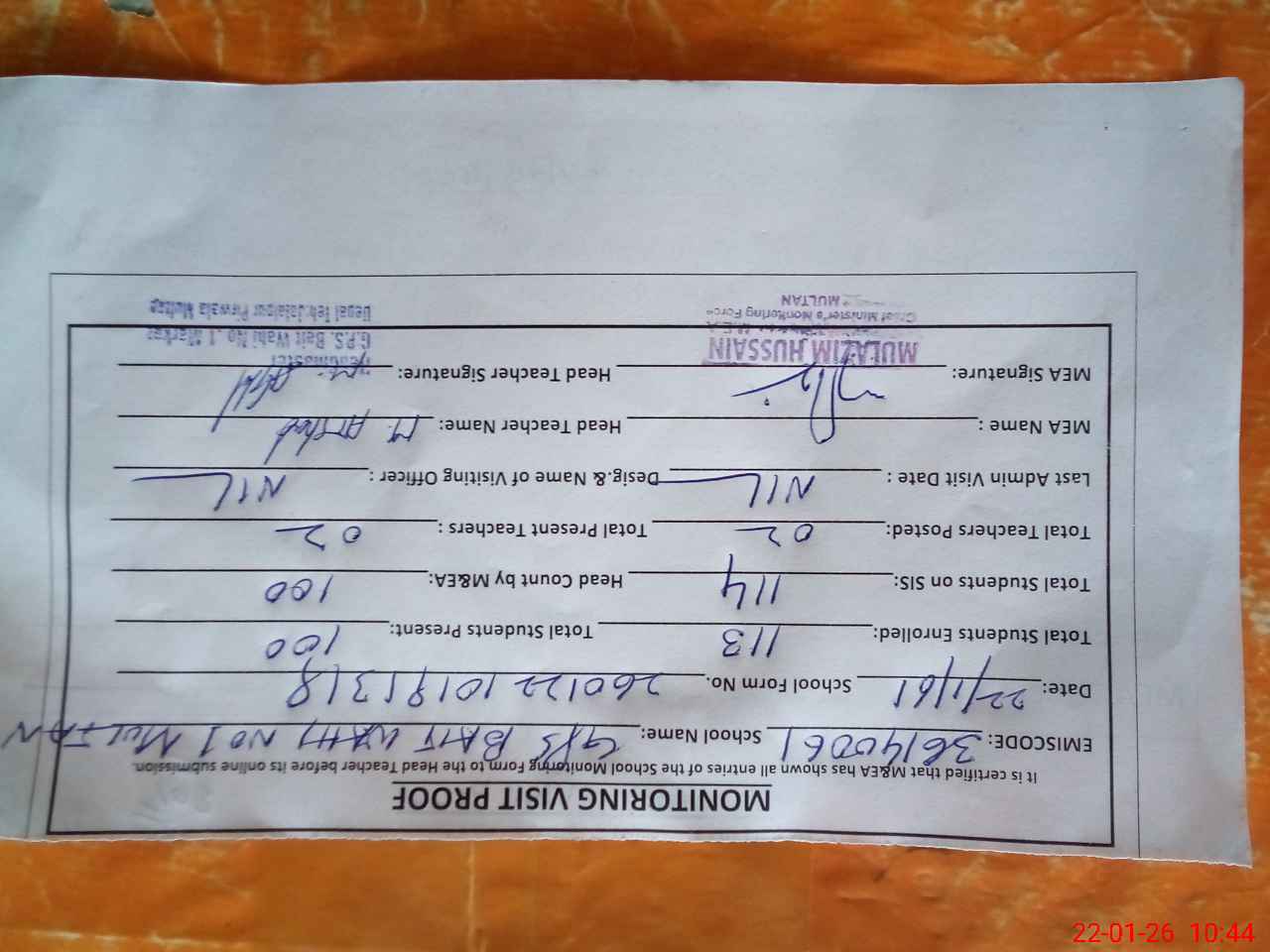 | Certified that this School was Inspected by the Undersigned MEA/DMO Today and the Information Stated Above is as Per Record. | |||||
