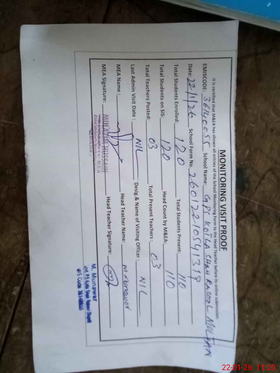 | Attendance Register | Head Teacher | MEA with School | Visit Proof |