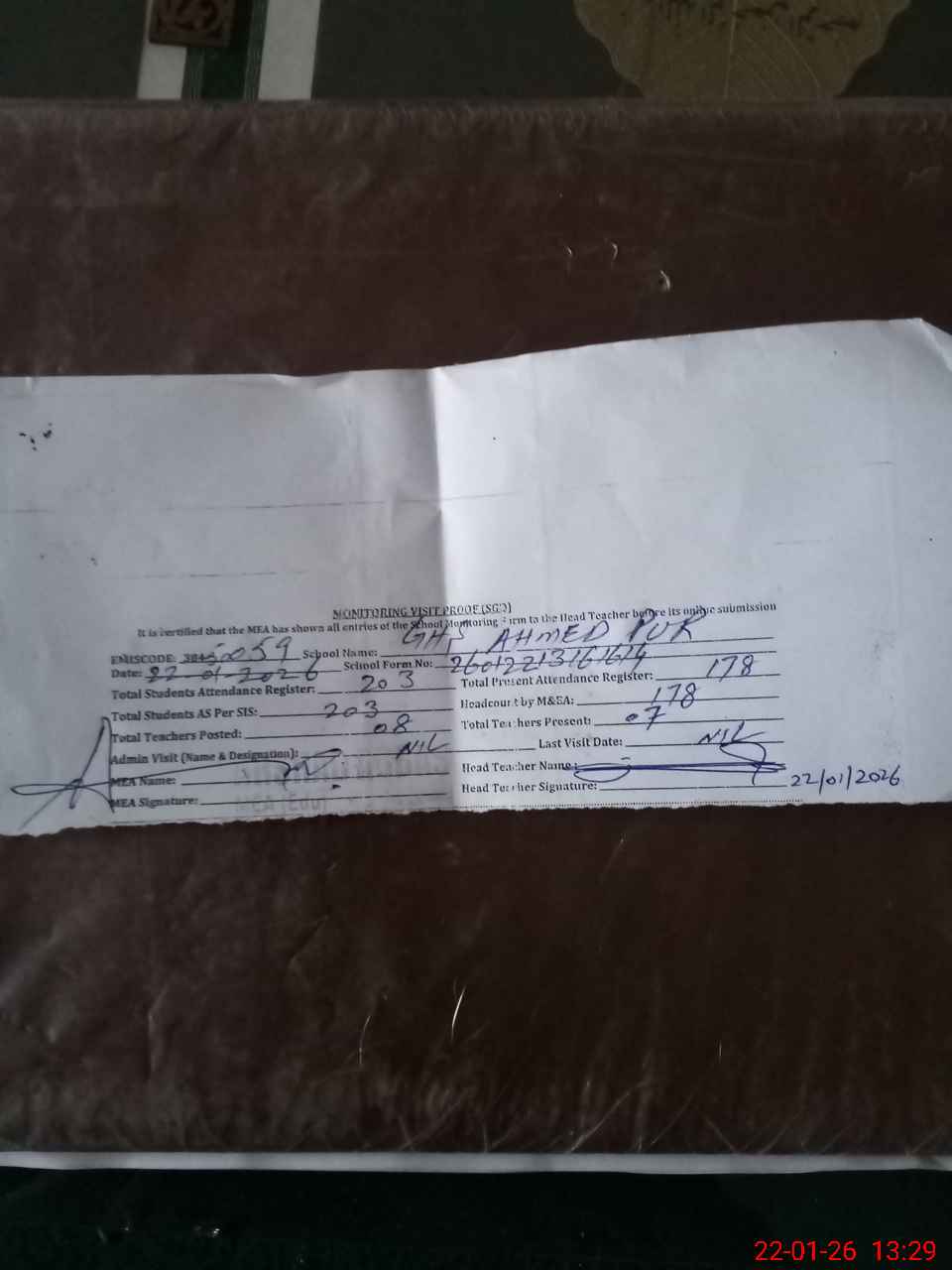 | Attendance Register | Head Teacher | MEA with School | Visit Proof |