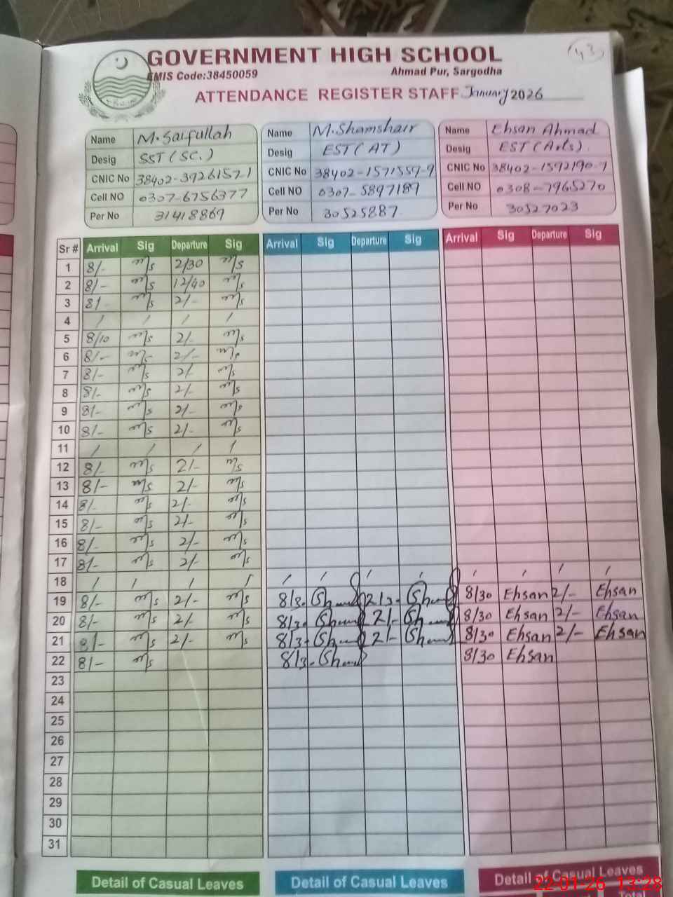 | CNIC | Full Name | Designation | R/C | Absence during last cal. month |