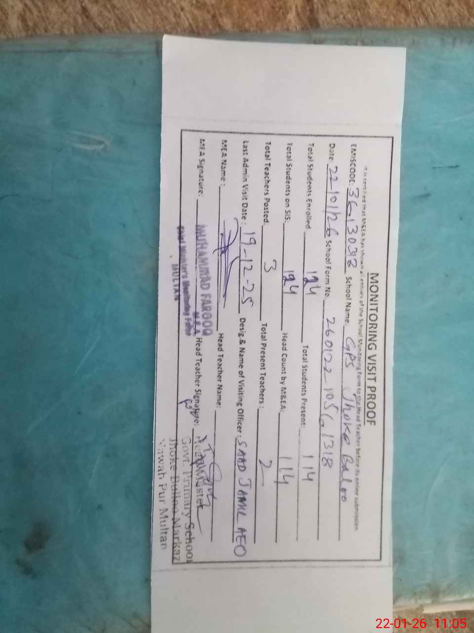 | Attendance Register | Head Teacher | MEA with School | Visit Proof |