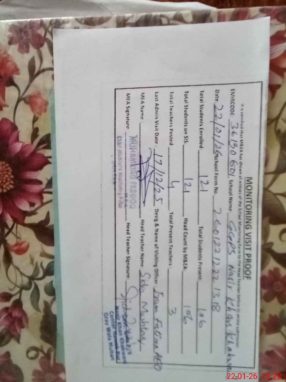 | Attendance Register | Head Teacher | MEA with School | Visit Proof |