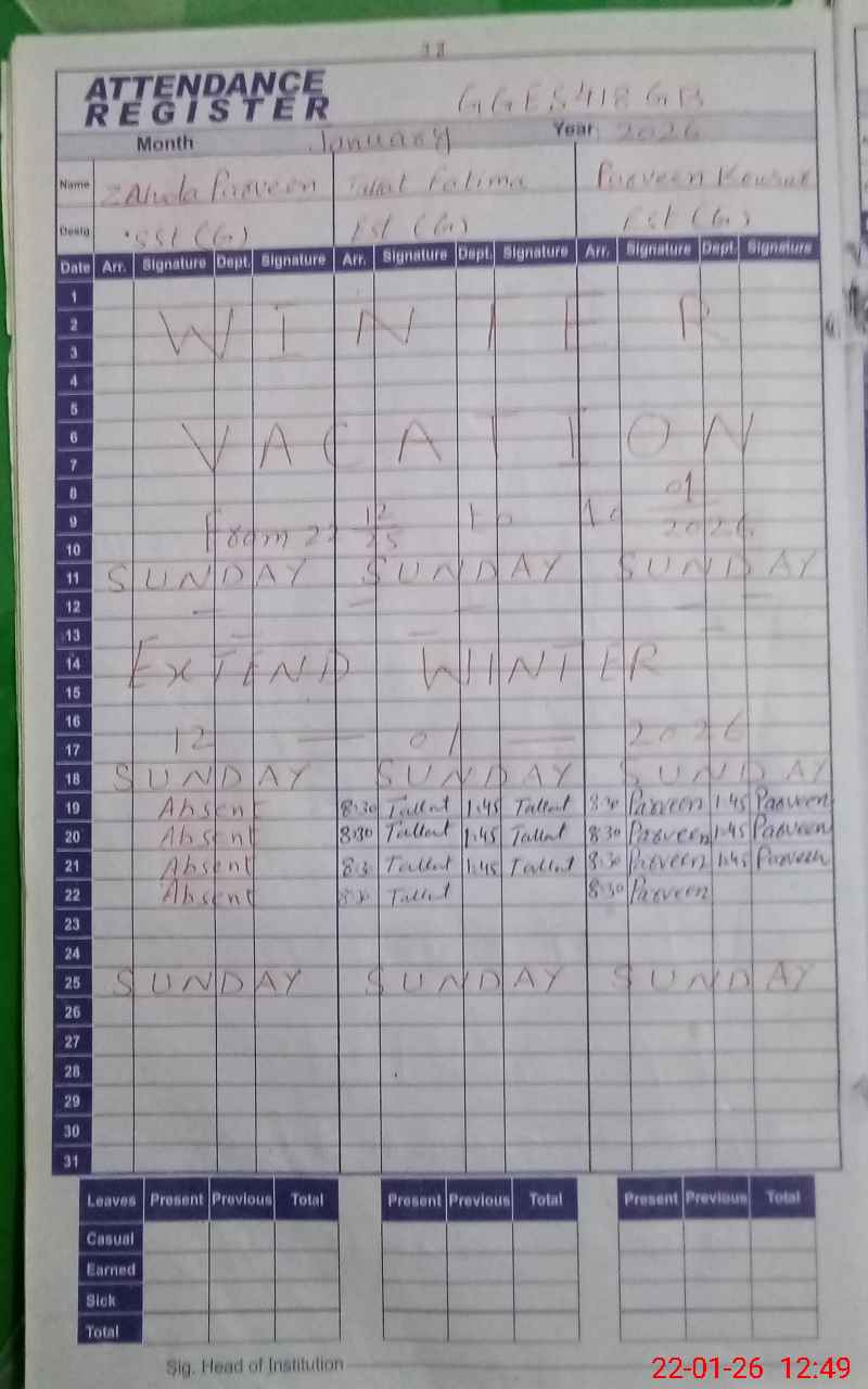 | 33**** | Za**** Pe**** To**** | SST Arts | Regular | 0 | 0 | 31 | 0 | 0 | 0 | 0 | 0 | 0 | Absent (Un-Authorized) |