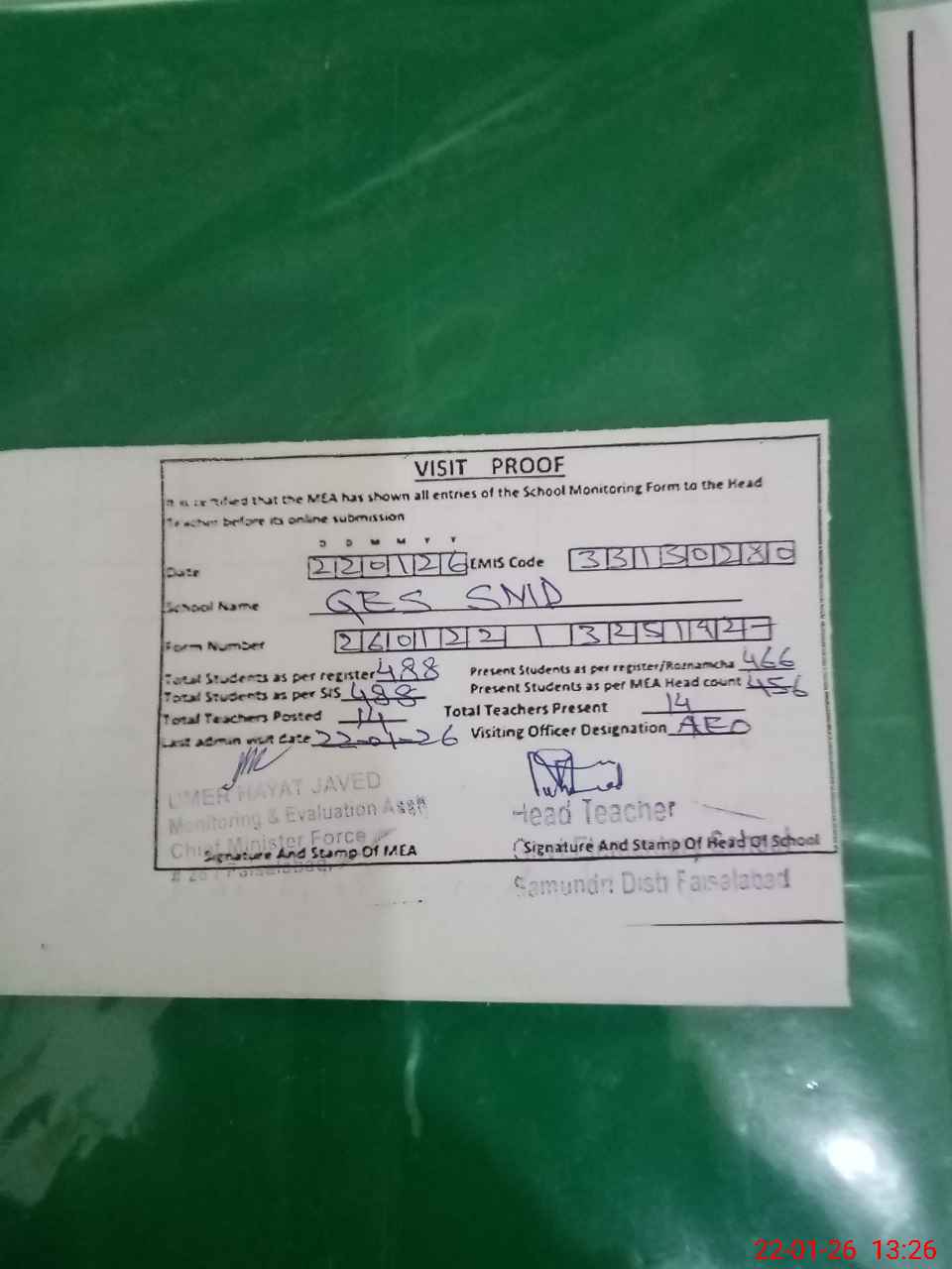 | Certified that this School was Inspected by the Undersigned MEA/DMO Today and the Information Stated Above is as Per Record. | |||||