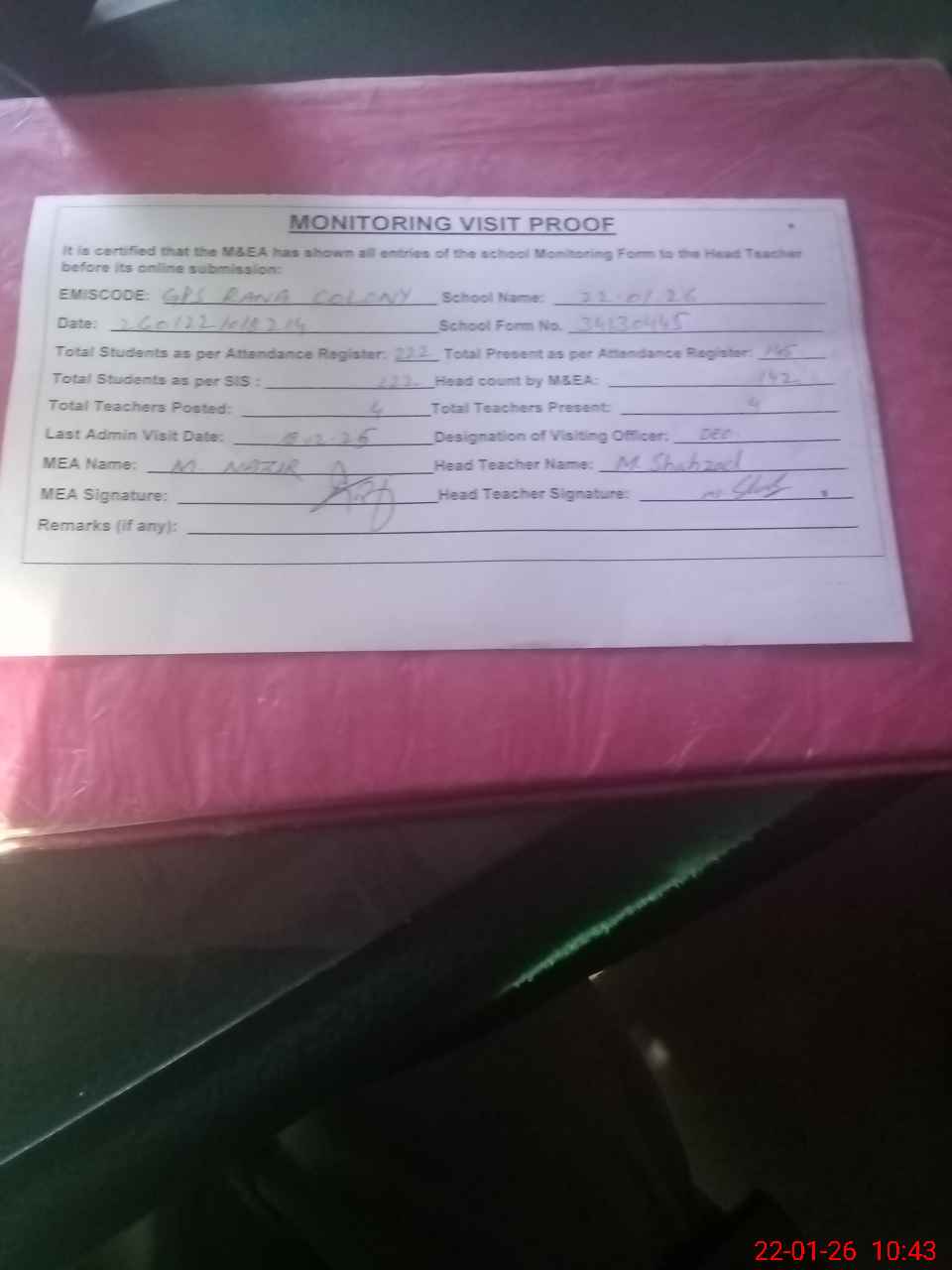 | EMIS Code: 34130445 | Name of School: GPS RANA COLONY | |||