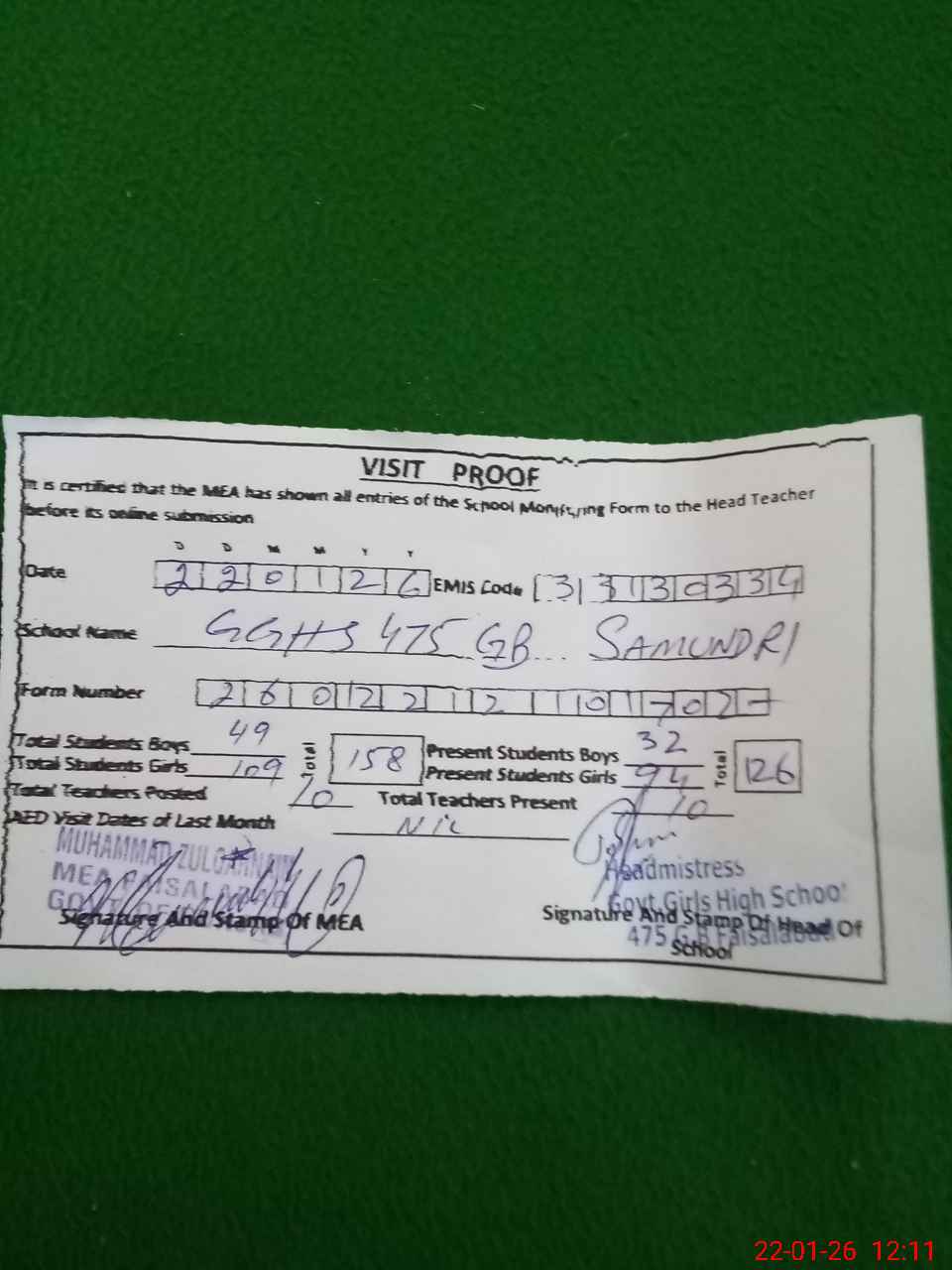 | Attendance Register | Head Teacher | MEA with School | Visit Proof |
