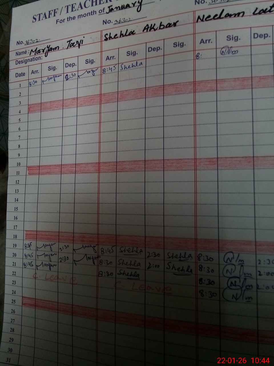 | CNIC | Full Name | Designation | R/C | Absence During Last Calender Month |