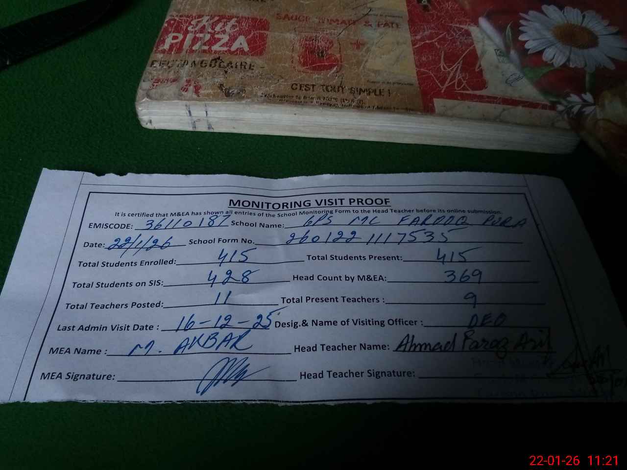 | Attendance Register | Head Teacher | MEA with School | Visit Proof |