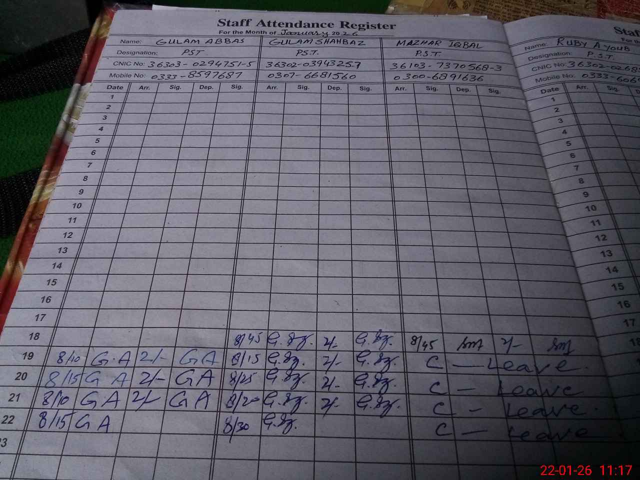 | CNIC | Full Name | Designation | R/C | Absence during last cal. month |