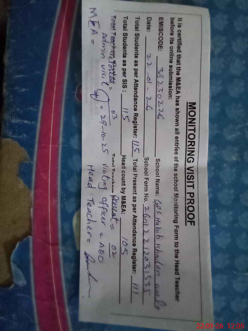 | Remarks (Use Separate Page if Required): AEO visited school on 29 October 2025 students strength on sis 115 | |||||