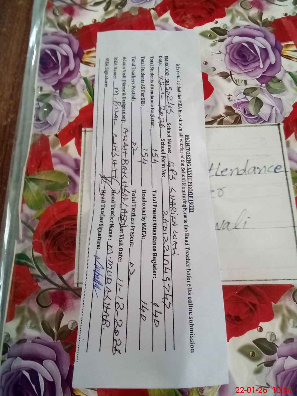 | Attendance Register | Head Teacher | MEA with School | Visit Proof |