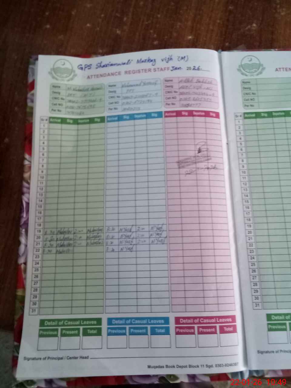 | CNIC | Full Name | Designation | R/C | Absence during last cal. month |
