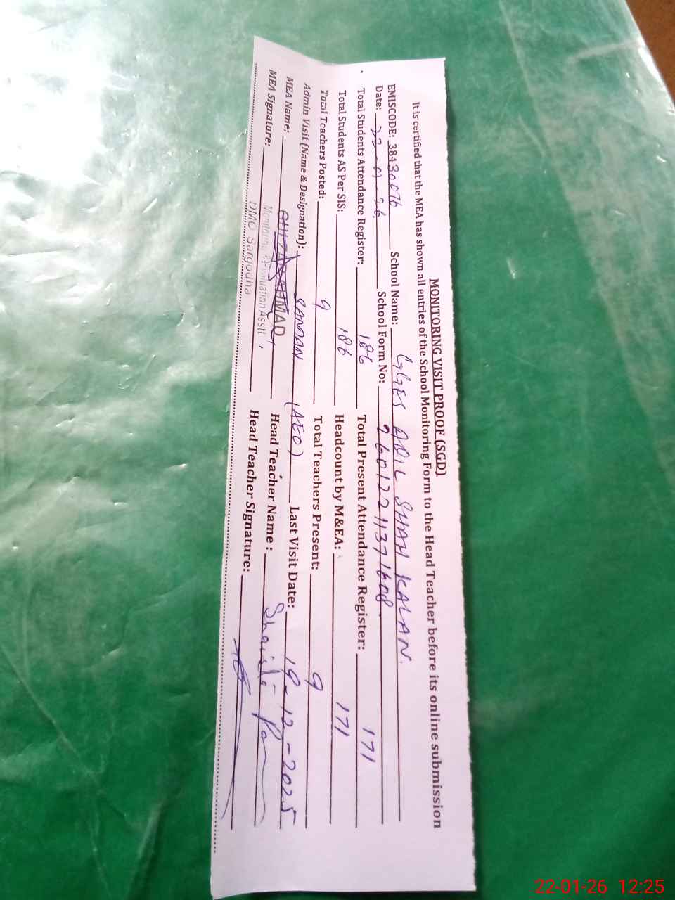 | Attendance Register | Head Teacher | MEA with School | Visit Proof |