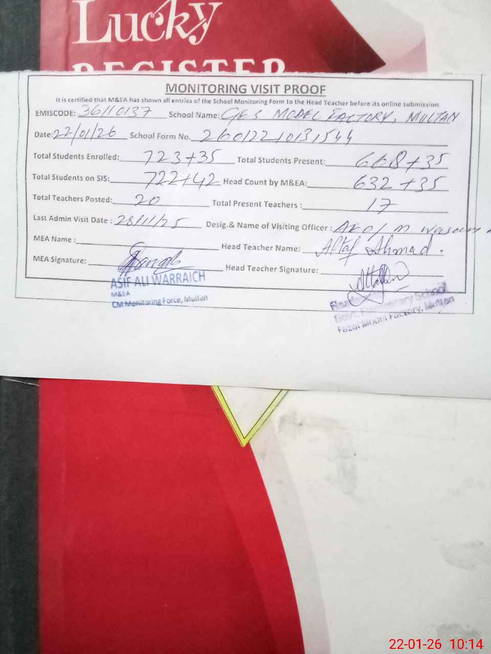 | Attendance Register | Head Teacher | MEA with School | Visit Proof |