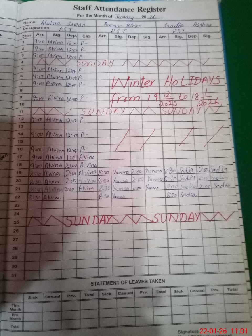 | Leave | Duty | Absent | Maternity | Medical | Ex- Pak |