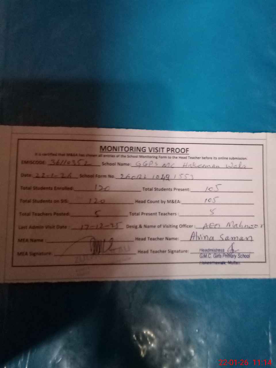 | Attendance Register | Head Teacher | MEA with School | Visit Proof |