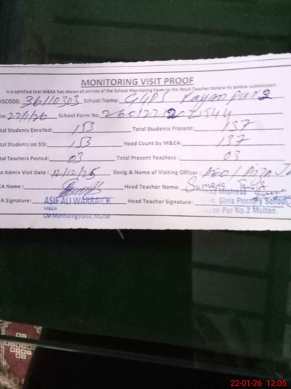 | EMIS Code: 36110303 | Name of School: GGPS KAYAN PUR NO 2 QASBA MARAL ROAD MULTAN | |||